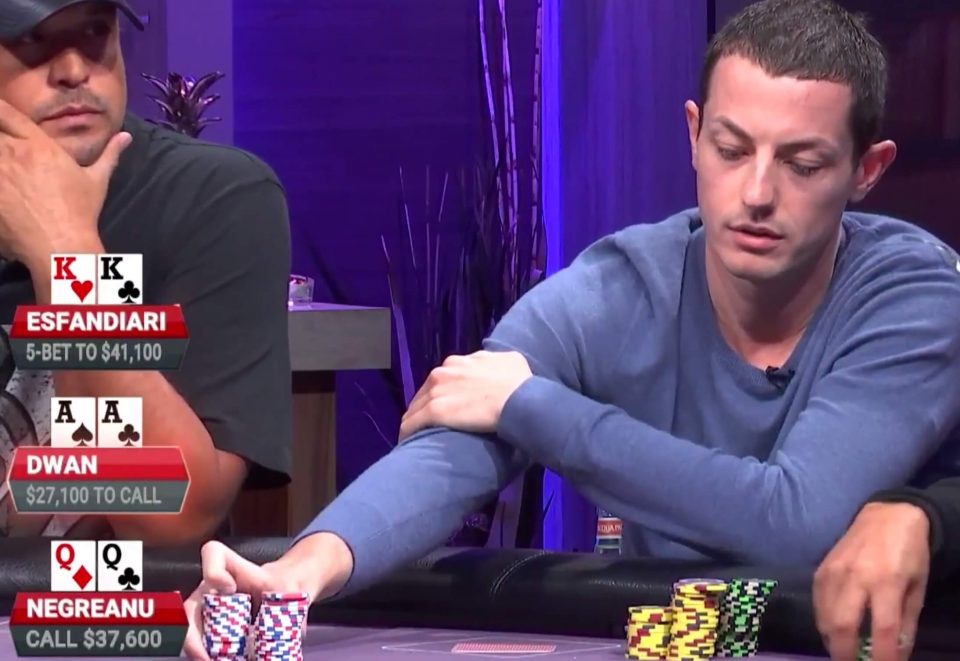 Телевизионное покерное шоу Poker After Dark вновь появилось в эфире канала Poker Central. Оно ознаменовалось очень жесткой раздачей. Так, в ней приняли участие четыре успешных покериста — Антонио Эсфандиари, Том Дван, Кид Покер и Даниэль Негреану. Уже на префлопе Кид был «выбит» соперниками из раздачи. На флоп зашли только три игрока. Такая улица ознаменовалась крупными ставками. Эсфандиари сделал рейз до $41.000, тогда как Негреану достаточно долго раздумывал над коллом, но все же решился на него. Однако Дван решил удивить своих соперников и пошел в олл-ин, поставив $328.000. Эсфандиари ответил коллом, а Негреану решил уйти в пас.